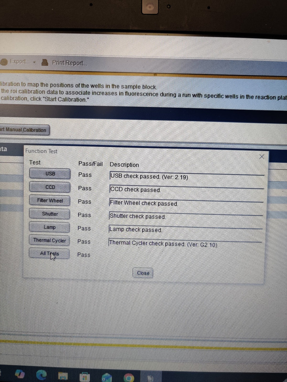 Please Note: While the instrument passed all hardware function tests and thermal diagnostics, the system software currently indicates that ROI, Background, Optical, and Dye calibrations are required. The buyer will need to perform these standard calibrations before starting quantitative research runs.