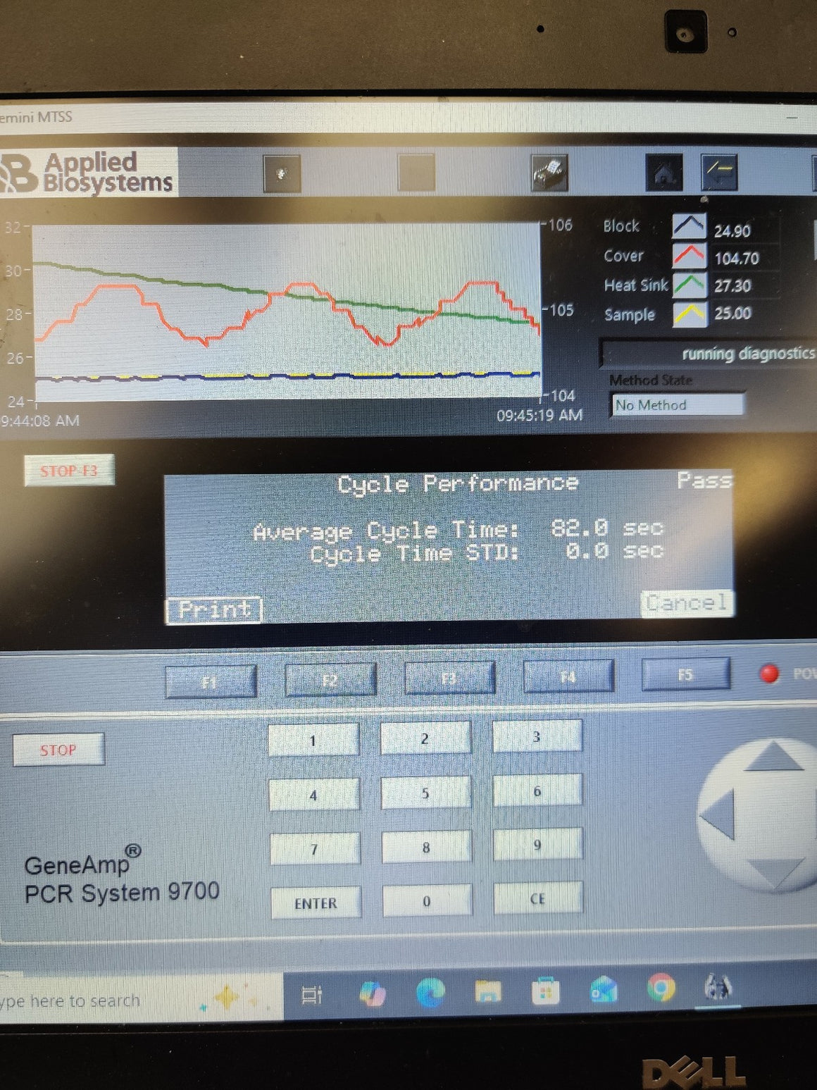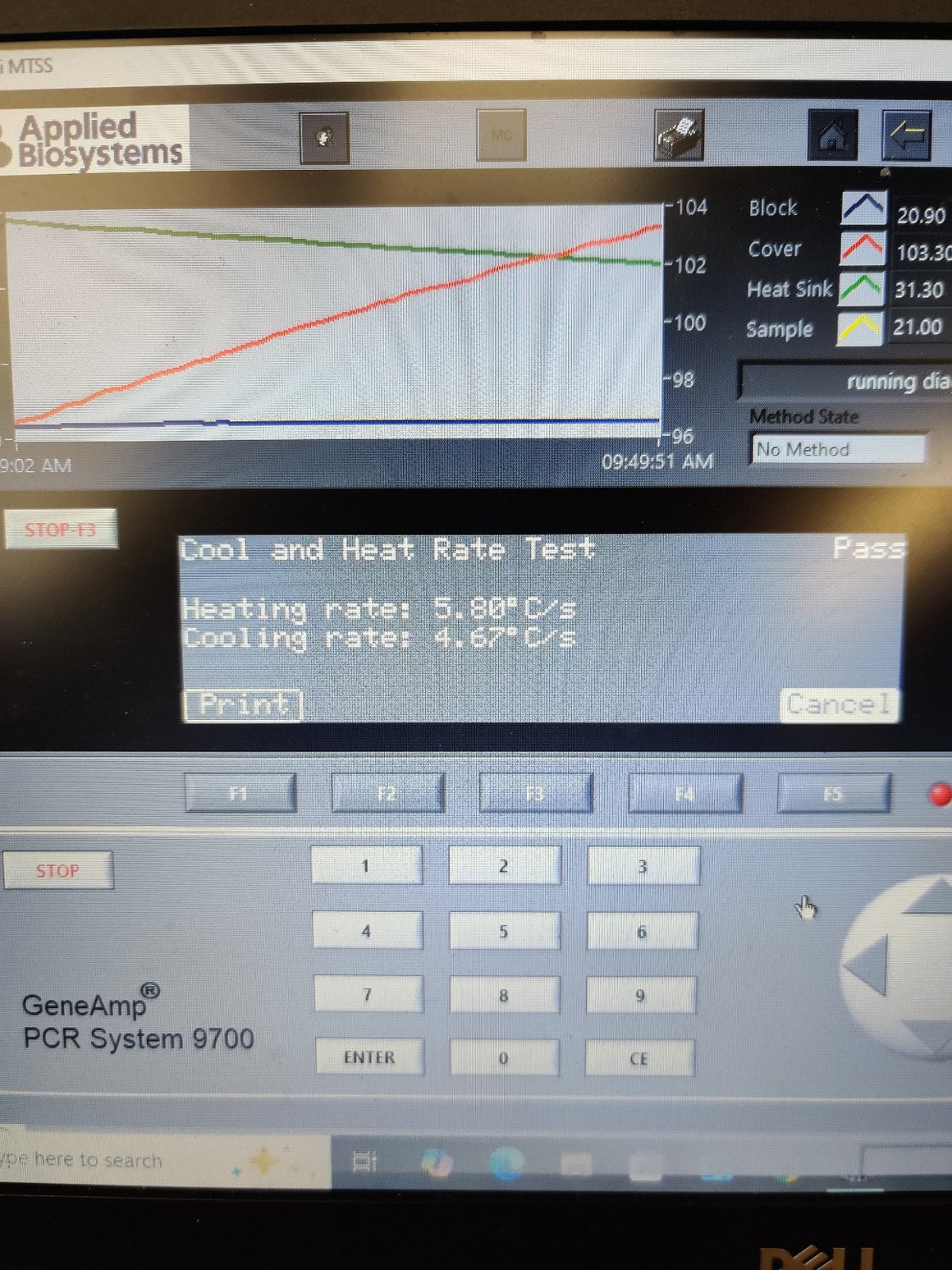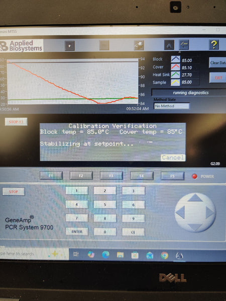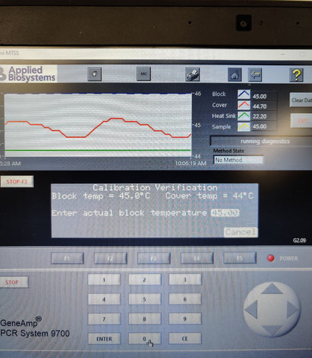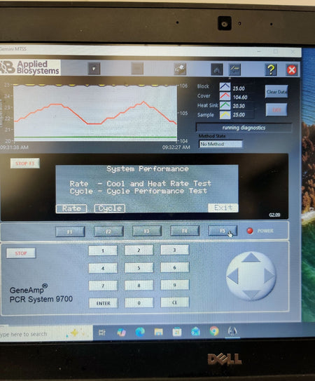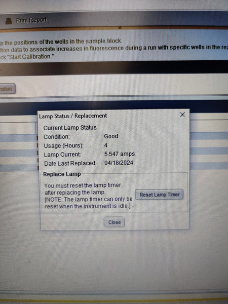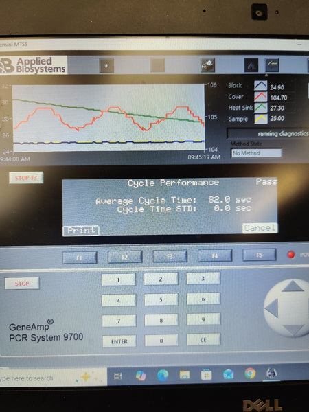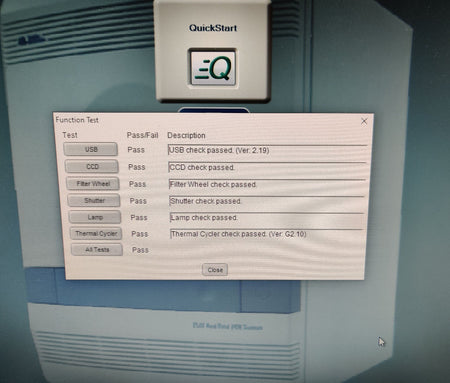 Used, excellent working condition, and has passed all comprehensive system self-tests. Integrated diagnostics confirm that the USB, CCD, Filter Wheel, Shutter, Lamp, and Thermal Cycler are all fully operational with 'Pass' status. Performance testing shows a strong Heating Rate of 5.80°C/s and a Cooling Rate of 4.67°C/s. The unit successfully passed the Cycle Performance test with an average cycle time of 82.0 seconds and 0.0 STD. Calibration verification was performed at multiple setpoints (45°C and 85°C), with the block and cover temperatures stabilizing accurately.