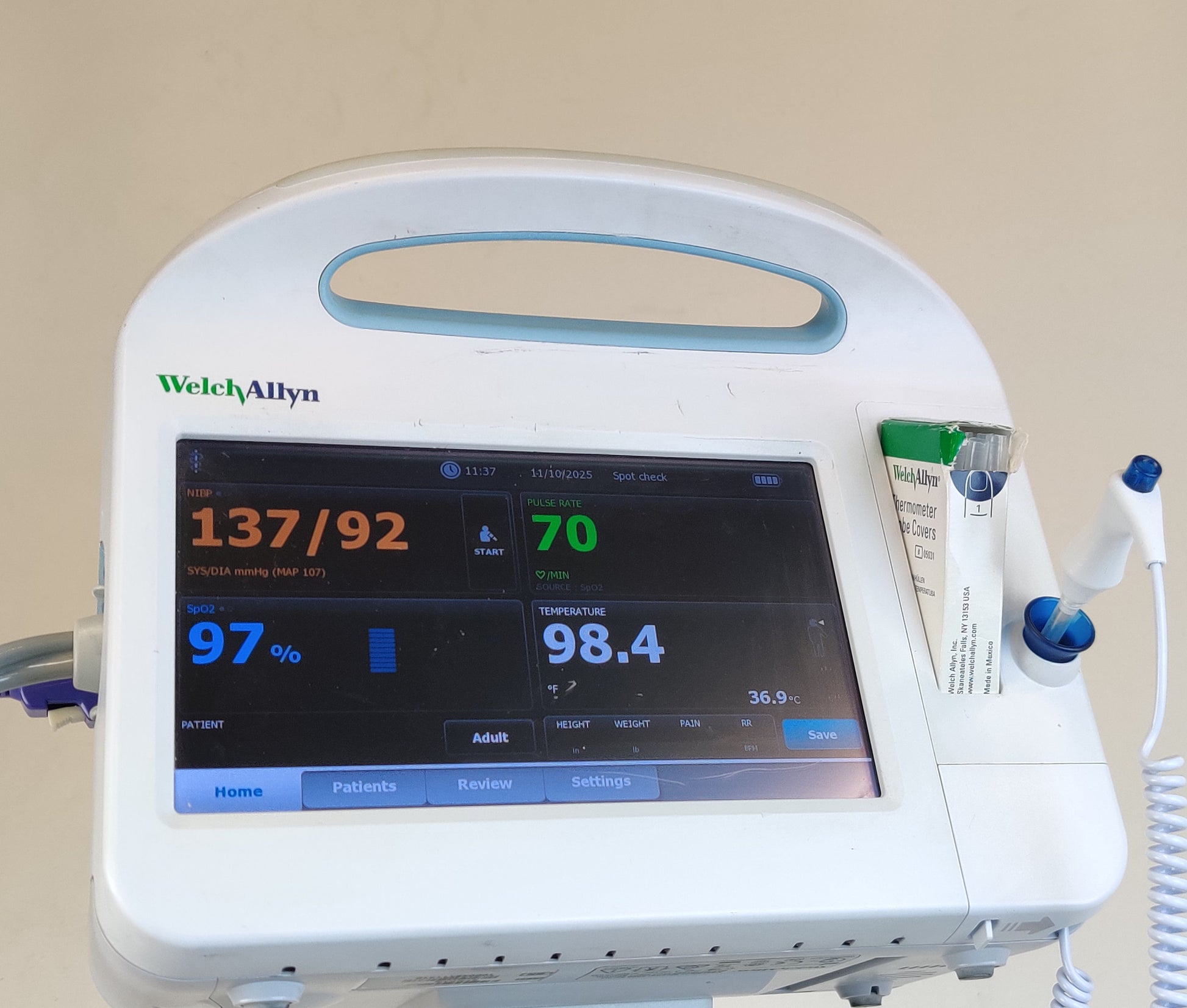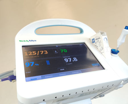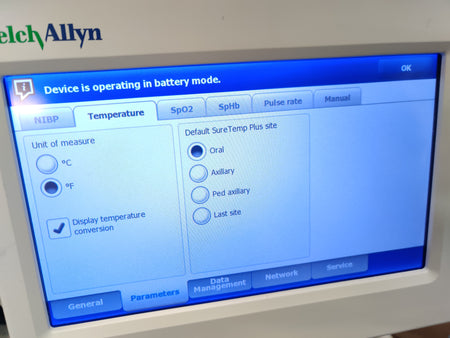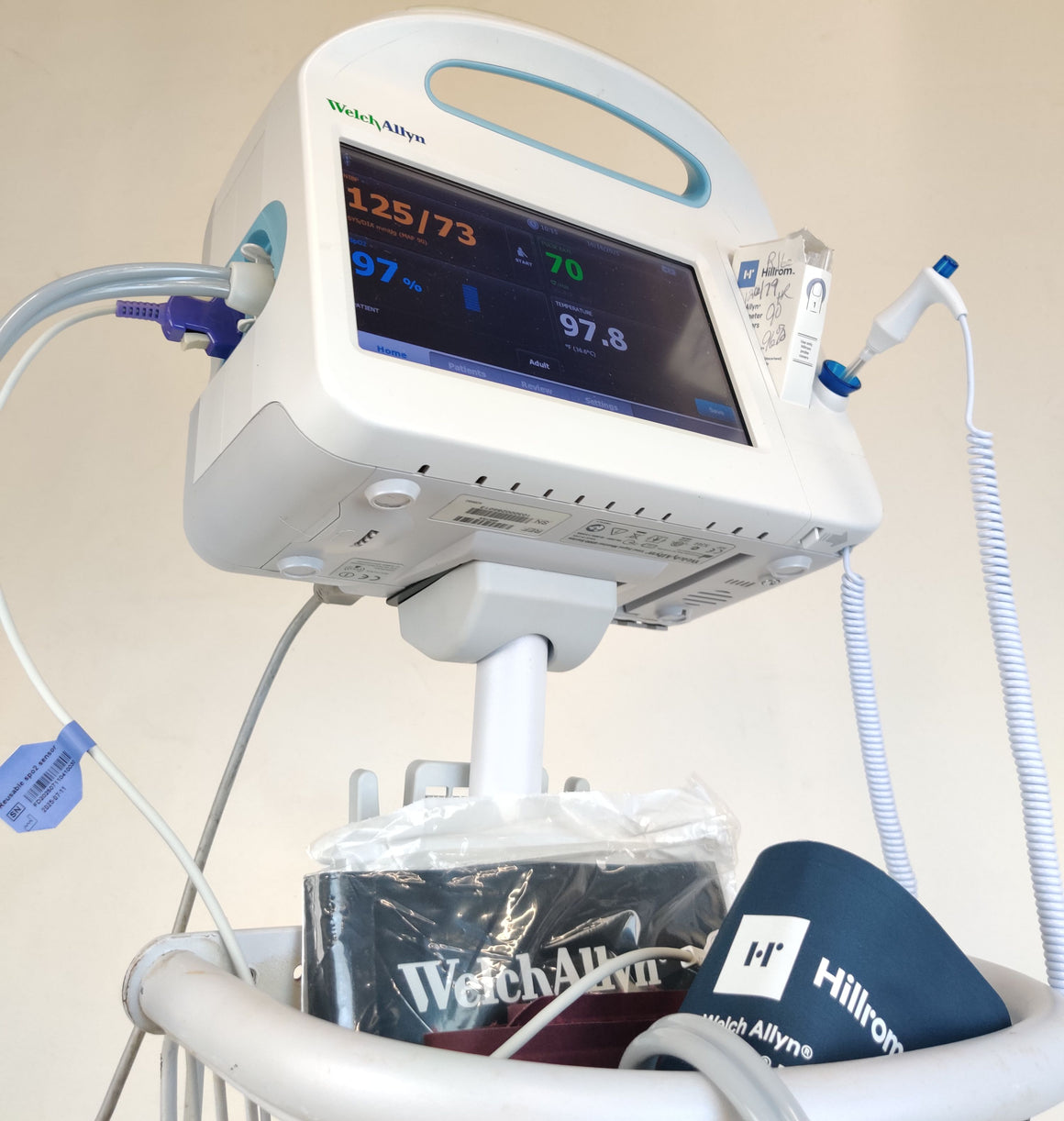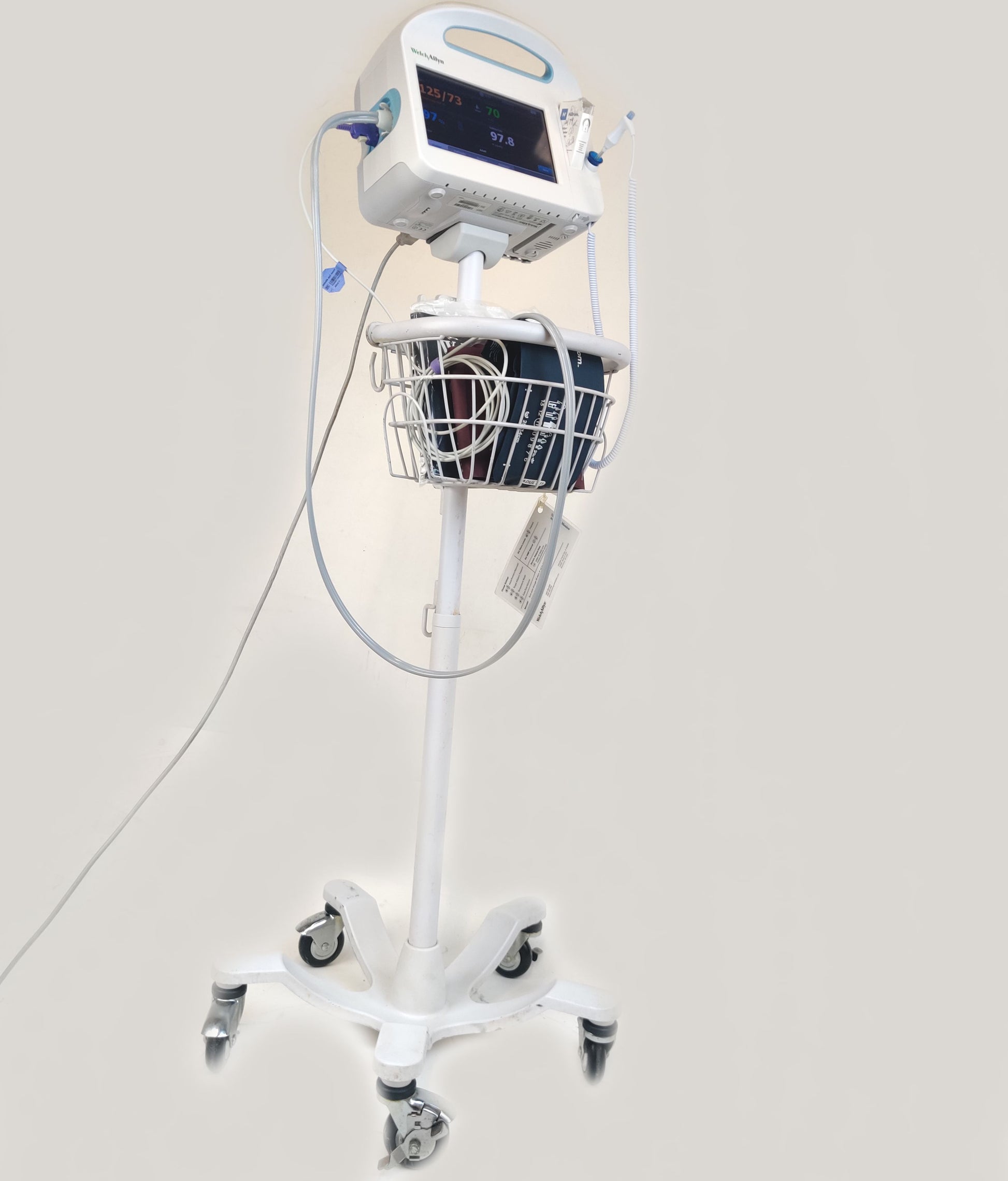 Used, excellent working condition, monitors are in excellent condition, it comes with a working battery, a basket with wear as shown in pictures, and accessories are included. This device can communicate via wireless to an EMR.